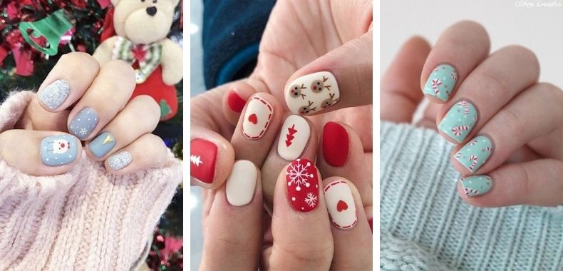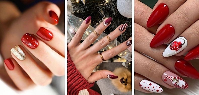 Stili e foto di tutte le nail art per le feste di Natale tra cui rosse bianche semplici colorate paritcolari e con disegni.